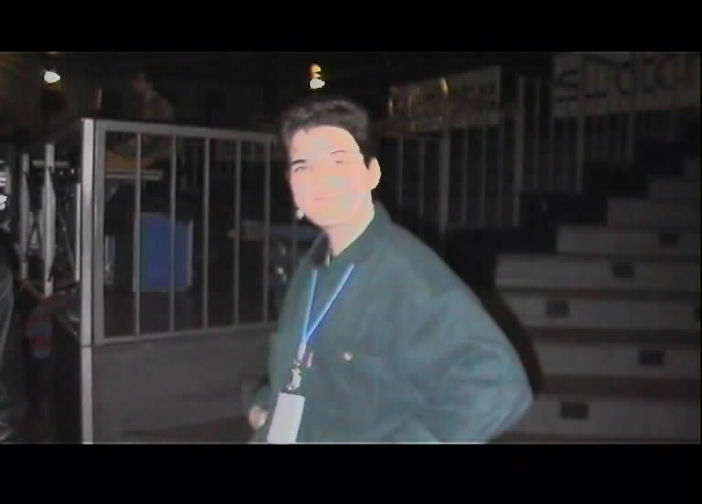DAY FIVE : MILAN Italy here we come! : Midge ![]() Are we ever going to get there??? Upon our arrival you could imagine our great surprise when we realised that Swatch had turned an average rock venue into a glittering palace of watch cack! Stuff hung from every available nook and cranny adorning walls and festooning ceilings, so much so that it resembled a watch convention and not what we thought .... a M.U. concert! This was swiftly corrected. We also found a bootleg teeshirt seller selling his elicit wares directly in front of the venue! After applauding his boldness he was subsequently moved on in a businesslike manner by Berenice! ![]() ![]() Cerise finally arrives! |